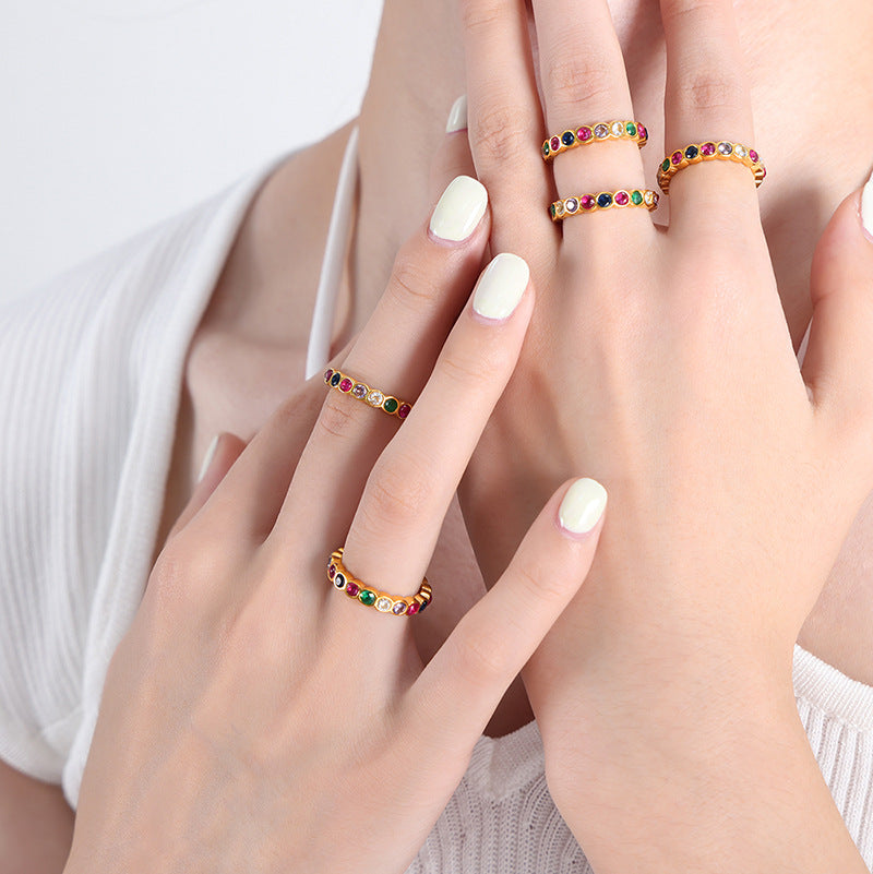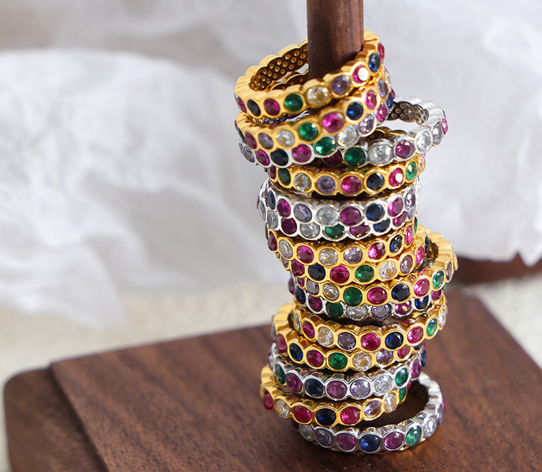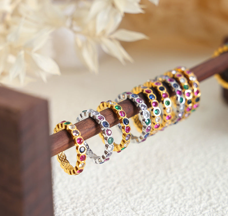 Exquisitely dazzling 18K gold inlaid colored zircon design rings usually have the following features and descriptions: