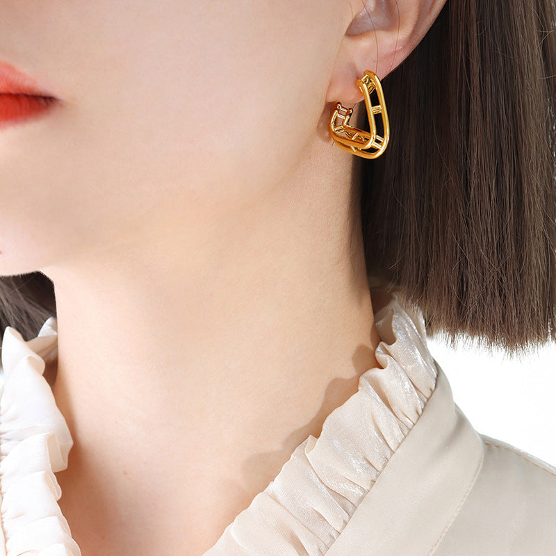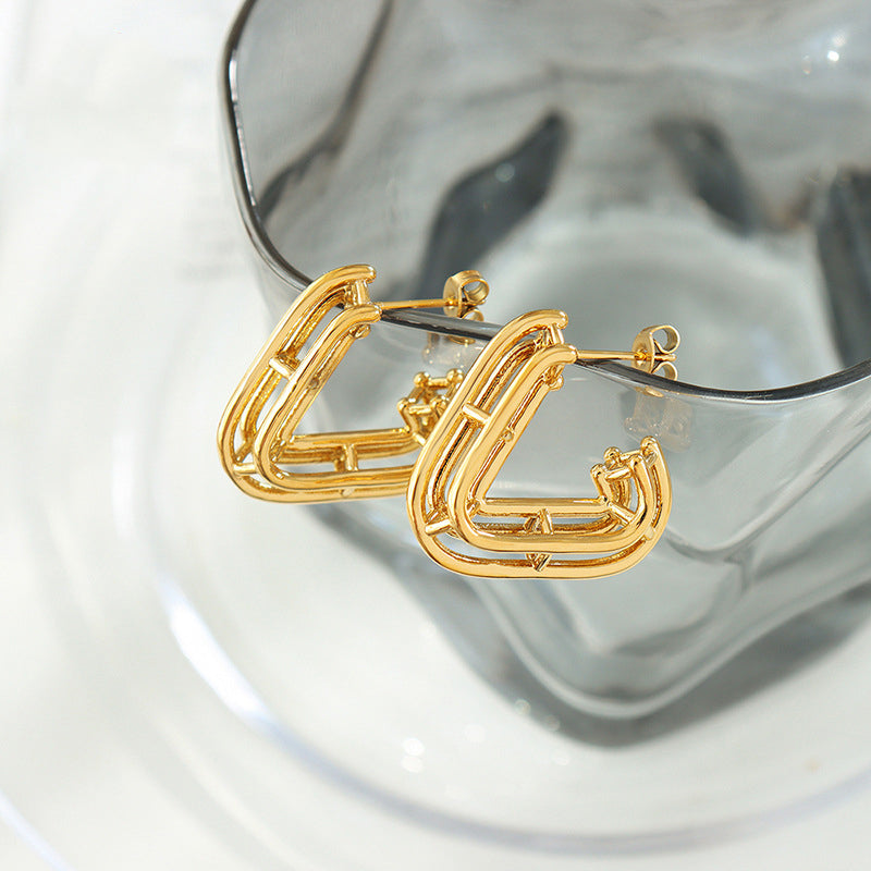 18K Gold Exquisite Simple Hollow Triangular Multi-layer Stitching Design Versatile Earrings