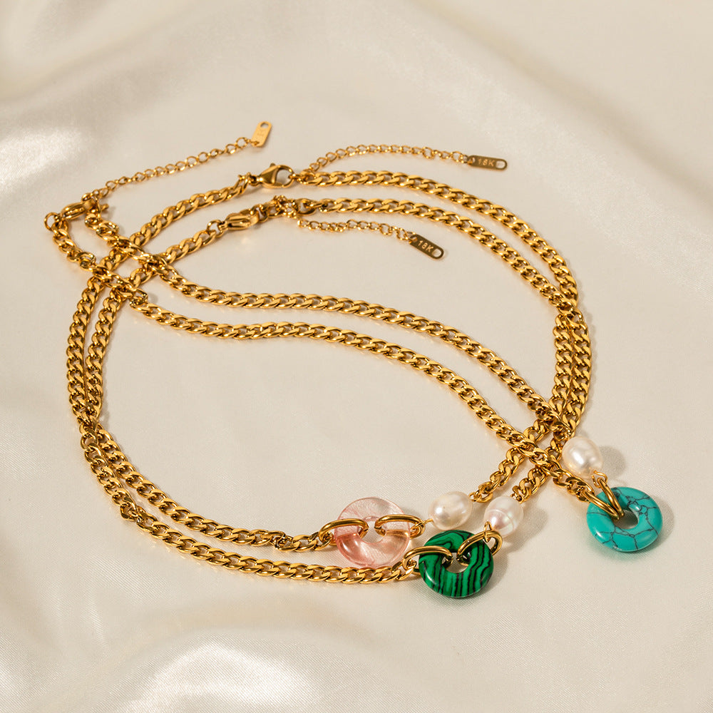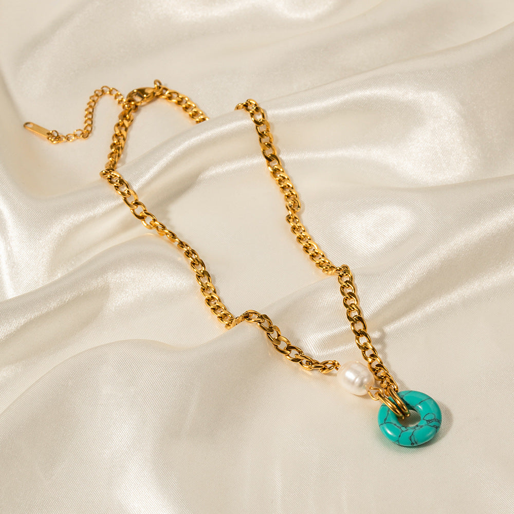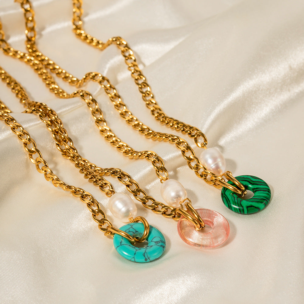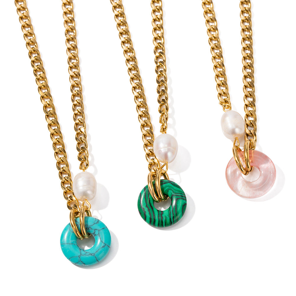 This stylish statement necklace in 18K gold is paired with a Cuban chain and a natural stone ring pendant, showing a unique design style and personality charm.
