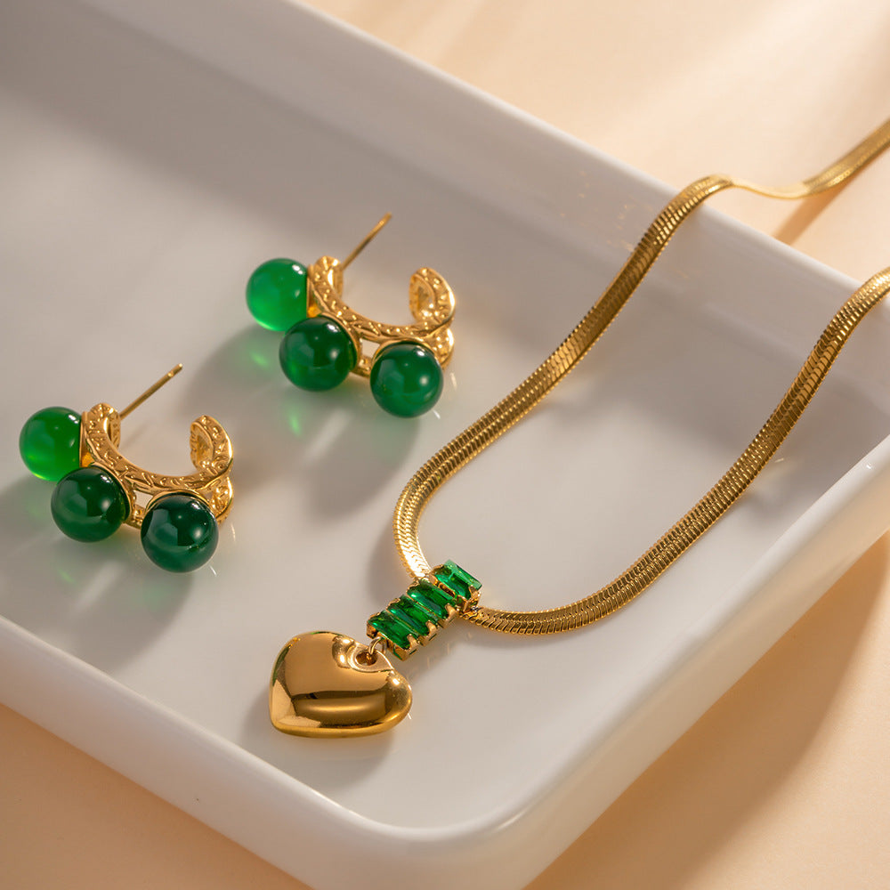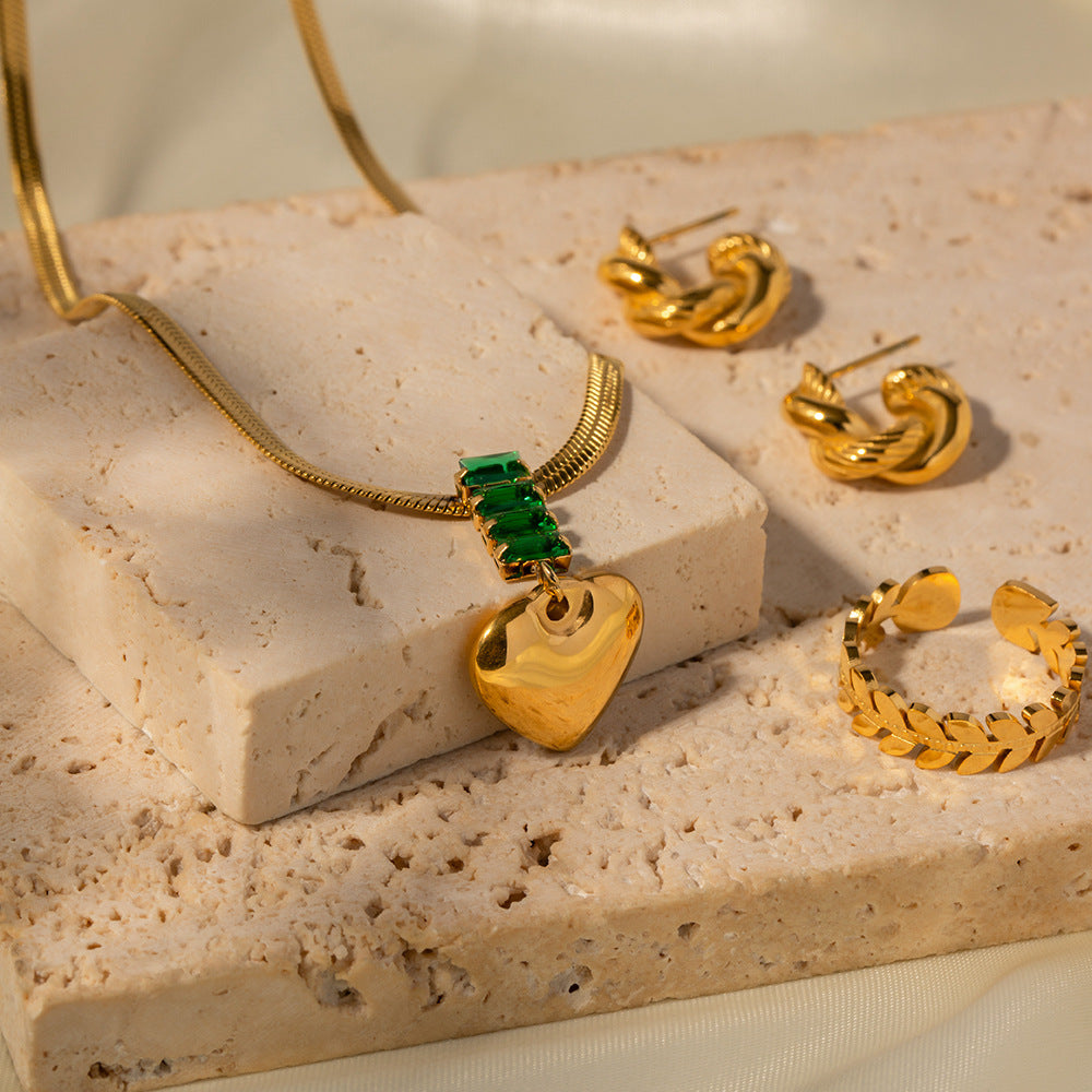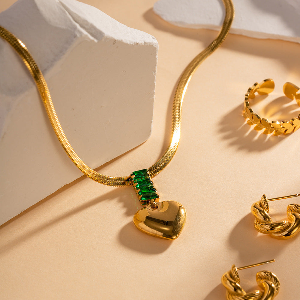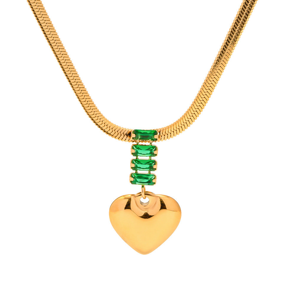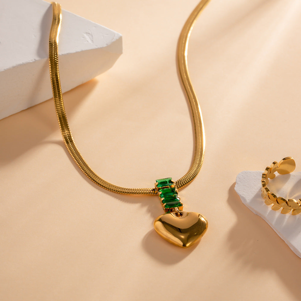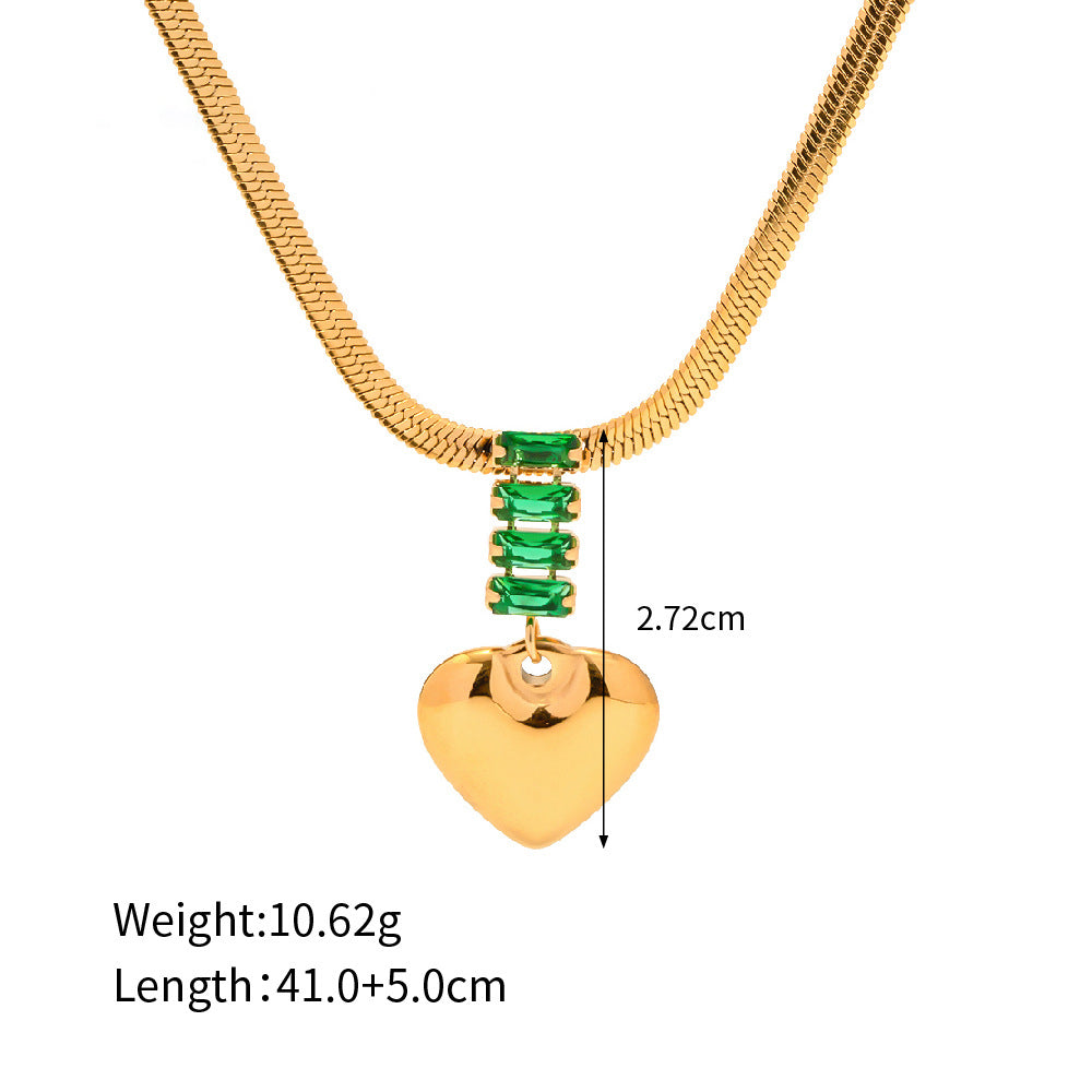 18K Gold Fashion Retro Heart Inlaid Green Zircon Pendant Design Versatile Necklace