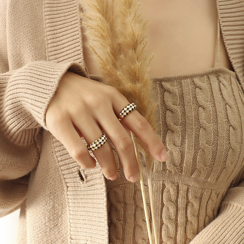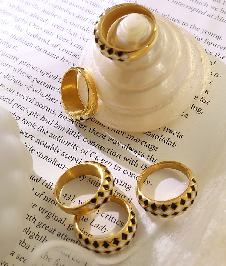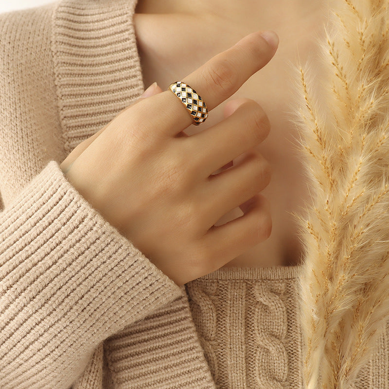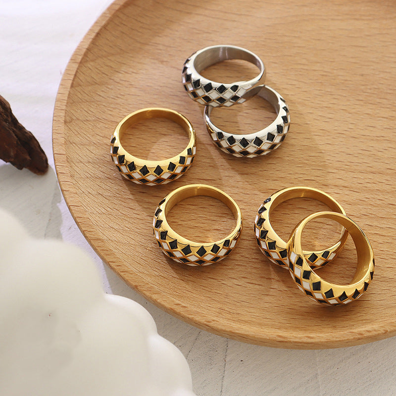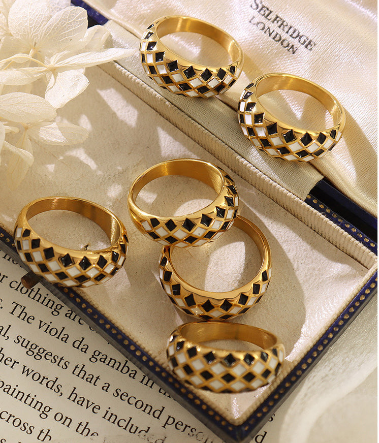 18K Gold Fashion Simple Rhombus Black and White Checkerboard Design Ring