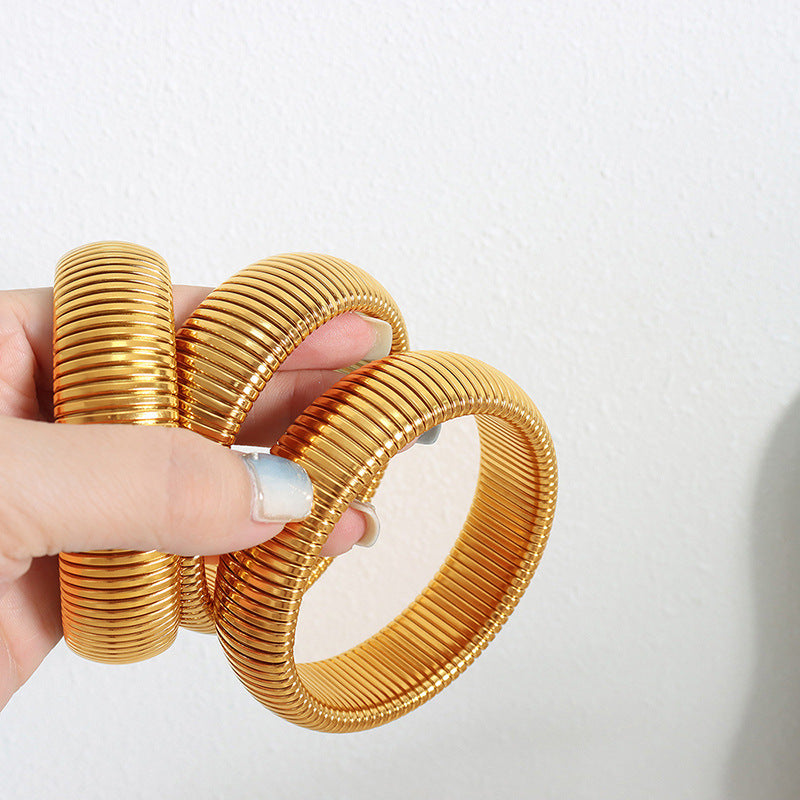 18K gold trendy exaggerated wide style bracelets with line design are usually jewelry with eye-catching appearance and unique design. The following are features that may be included in such a bracelet: