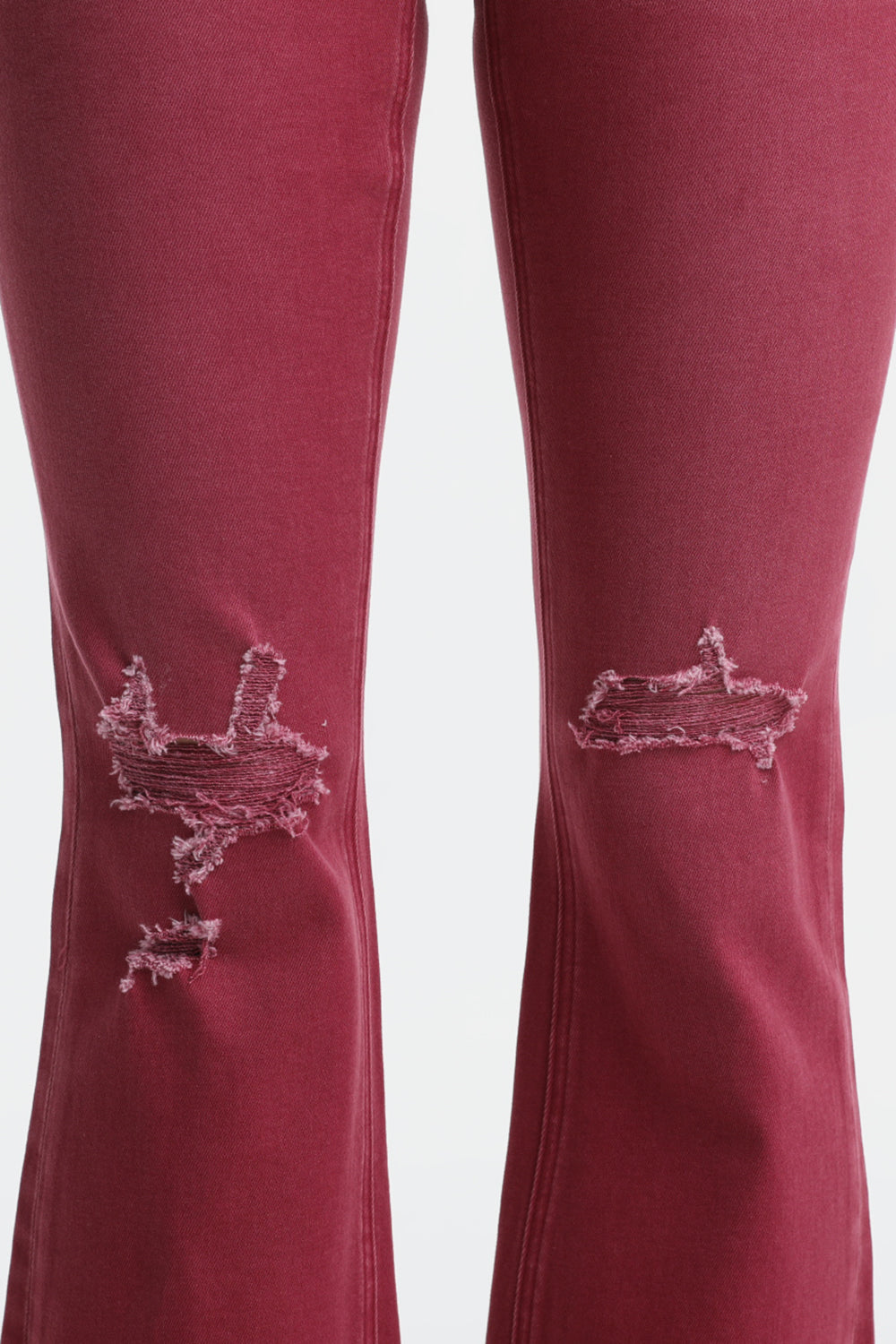 Introducing our High-Waisted Flared Trousers in a beautiful rose pink hue. These trousers offer a stylish and feminine touch to any ensemble. The high-waisted design accentuates your curves and creates a flattering silhouette. What sets these trousers apart is the unique distressed effect at the knees and hem, adding a hint of edginess and personality. Whether you're dressing up for a special occasion or creating a chic everyday look, these flared trousers will elevate your style. Pair them with a fitted blouse and heels for a sophisticated outfit, or dress them down with a casual tee and sneakers for a more relaxed vibe. Versatile and trendy, these high-waisted flared trousers are a must-have addition to your wardrobe.