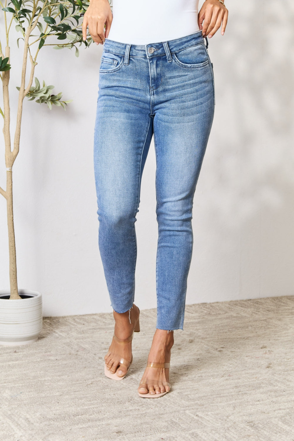 These raw hem skinny jeans are the perfect combination of comfort and style with their distressed details and form-fitting silhouette. The raw hem adds an edgy touch, making them a trendy choice for everyday wear.