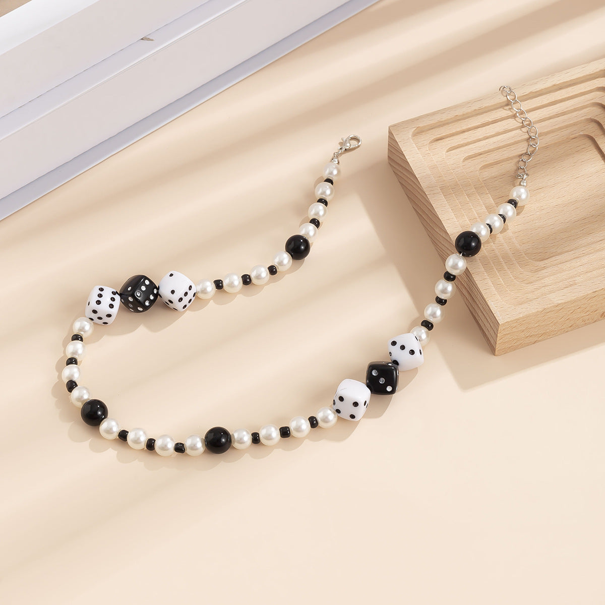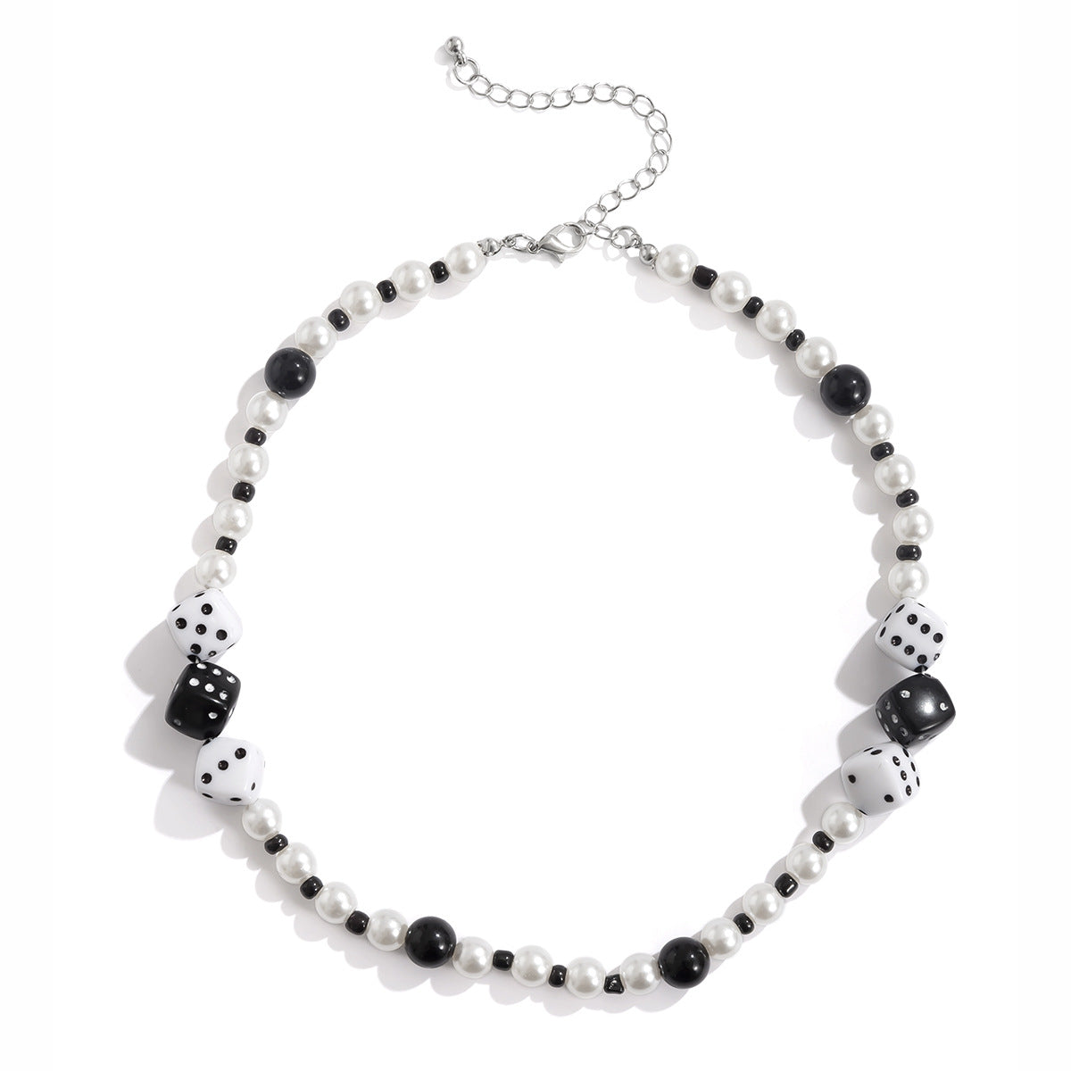 Pearl and dice mosaic: The necklace features a pearl and dice mosaic design, combining classic pearls with stylish dice elements. Pearls represent elegance and nobility, while dice reflect playfulness and style. This patchwork design creates a unique style that combines traditional and modern, classic and trendy.